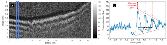 During the measurement procedure with the commercial OCT setup, the software provided by the manufacturer is implemented assuming that orthogonal polarization states in the detector are perfectly matched during the calibration procedure. For this reason, the output of the setup are cross-sectional images of round-trip phase retardation (0 deg ≤ δ ≤ 180 deg) according to Equation (3).