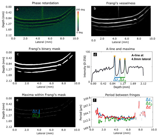 Phase retardation image obtained with PS-OCT module (a). Fringes highlighted with Frangi’s vesselness (b). Fringes binary mask (c). Average of 10 A-scans at 4.0 mm lateral scan range showing identification of maxima and periods (d). Δz1 represents period between the first two fringes, Δz2 between second and third fringes (e). Period obtained for every A-scan and average period Δz (f). Absence of period in some points of is due to lack of period detection at these lateral scan positions.