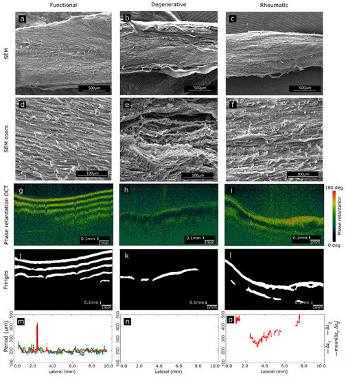 Degenerative CTs show decreased homogeneity and lower density of collagen fibers (Figure 4b), with degradation in some areas. This is seen as the development of spaces between the collagen fibers, structural disorder and presence of torn and fray fibers (Figure 4e). The loss of the ordered healthy structure is translated into the phase retardation B-scans as either a loss of the fringes or as a reduction of birefringence (Figure 4h,k) being the shown example a specimen where no period can be retrieved (Figure 4n).