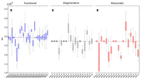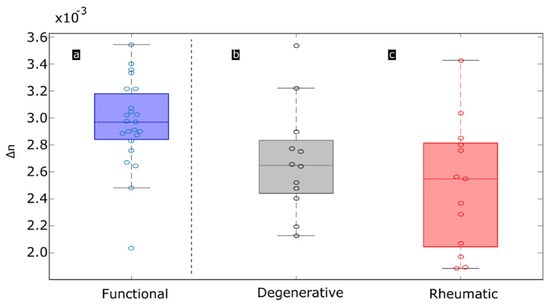 The median birefringence value is obtained for every CT specimen and represented for the three categories in Figure 6. As observed in Figure 7a (blue), functional CTs exhibit higher birefringence, with a median value of 2.9·10−3. Degenerative CTs (Figure 7b, grey) present lower birefringence, with a median value of 2.6·10−3. Rheumatic CTs (Figure 7c, red) present an even lower median birefringence value, being of 2.5·10−3.