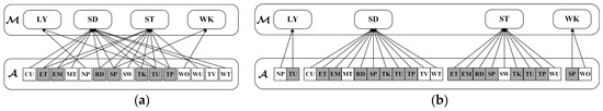 According to Equation (5), the hierarchy and correspondence of is shown in Figure 3a, and the activity in the dark square has multiple motion states. Meanwhile, we can convert the corresponding relation represented in Figure 3a into a group correspondence based on motion state by the activity repetition. The converted group correspondence is shown in Figure 3b.