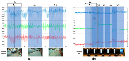 After the sensor data are classified by LSTM, the pre-trained CNN network is required to further classify the images (or image sequence) corresponding to the sensor data in each group. Therefore, there should be a correspondence between the sensor data and the images (or image sequence). In order to achieve the correspondence between the sensor data and the images/image sequence, we take the shooting time tc of each frame in the photo stream as the center and take a time window with a fixed width of tw, as shown in Figure 4a. All the sensor data in the window are the sensor data corresponding to the image and can be used as the input of the LSTM network to complete the training and motion state classification. It should be noted that, when the sampling rate of the photo stream is higher and tw is wider, there may be a time window overlap, as shown in Figure 4b.