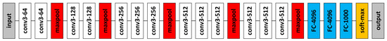 It is well known that the classification performance of deep neural networks depends not only on the network structure but also on the number of training samples. For egocentric activity recognition, existing public datasets, such as UCF11 [37], have not only a small number of samples but also a limited number of activities, so they are difficult to directly use to obtain well-trained CNN models for activity recognition with good performance. In order to overcome the problem of limited training, motivated by Simonyan et al. [38], we use the VGG-16 model [39], which was well-trained on ImageNet [40] and has achieved great success in the field of image classification, to extract the spatial features of each frame in the photo stream. The architecture of the VGG-16 network is shown in Figure 5.