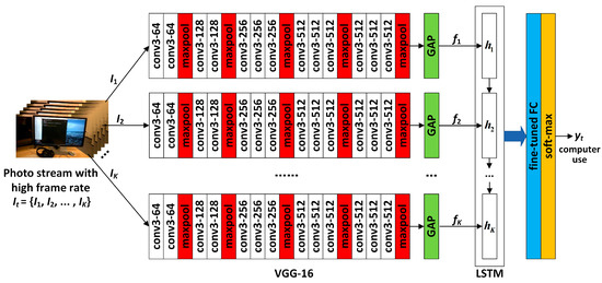 When the network is used for high-frame-rate photo streams, the structure is as shown in Figure 7. Let a certain image sequence corresponding to a certain activity in the photo stream contain K frames, i.e., . First, the deep convolution operation is performed on each frame through the VGG-16 network, and the convolution result of each frame is then converted into a spatial feature map by using GAP, which is denoted as . Next, is fed into a single-layer LSTM network to obtain the spatio-temporal features of sequence , denoted as . The spatio-temporal features are then fed into the fine-tuned FC layer so that activity classification is finally completed by the softmax layer, i.e.,