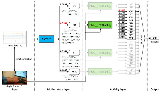 The overall architecture of the proposed hierarchical deep activity recognition framework, which is applied to the IMU+camera wearable hybrid sensor system, is shown in Figure 1. The wearable device (eButton) is a hybrid sensor system, and the acquired vision data are a photo stream. The process of activity recognition is divided into two layers: a motion state layer and an activity layer. Before the egocentric data are sent to the proposed framework, all the activities to be recognized are first grouped according to their motion state through the correspondence, . In all the groups, if a group contains only one activity to be recognized, it indicates that the activity can be directly recognized by IMU. In this case, the ADL is recognized directly in the motion state layer using the trained LSTM network. Conversely, if a group contains more than one activity to be recognized, which means that these activities are difficult to distinguish using only IMU data, they are further distinguished in the activity layer by photo stream through the pre-trained CNN (photo stream without time correlation) or CNN-LSTM (photo stream with time correlation).