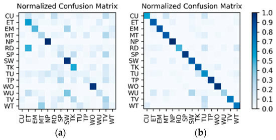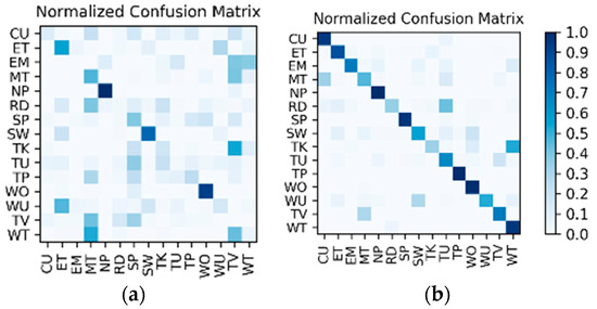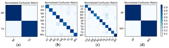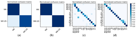 Lowest and highest accuracy confusion matrices for the VGG16-LSTM network corresponding to each group: (a,b) the WK/WK-US group; (c,d) the “SD/ST/CY group.