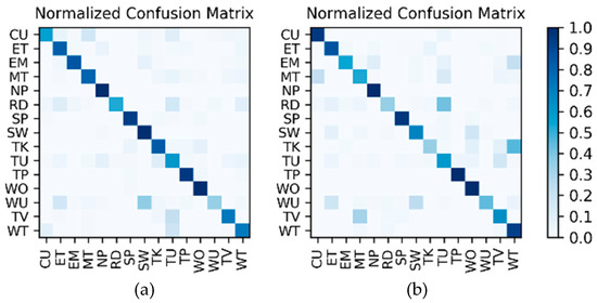Confusion matrices for the two splits with (a) the lowest accuracy and (b) the highest accuracy on motion sensor data in the Multimodal Dataset.