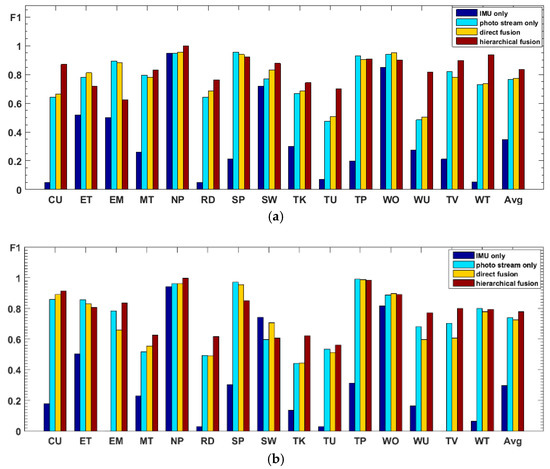 We implemented the proposed hierarchical deep fusion framework on the Keras+Tensor Flow (tensorflow-gpu==1.6) platform running on Ubantu and a Nvidia TitanX (Pascal) GPU. The definitions of , , and used during application of the proposed framework to the eButton Dataset are shown in Equations (3)–(5). For the proposed framework’s use with the Multimodal Dataset, is shown in Table 3, and and are defined as shown in Table 4, where is used for detailed performance evaluation and comparison with other algorithms, and the remaining grouping methods are used to evaluate the impact of different grouping methods on the performance of the proposed framework. In the eButton Dataset, the training set and the test set are given, respectively (as shown in Table 1 and Table 2), which are the egocentric hybrid data of the same wearer at different times. In contrast, there is no clear distinction between the training set and the test set in the Multimodal Dataset. We adopted the same method in [14] to divide the 200 sequences into 10 splits (each split containing 20 sequences, each of which corresponds to an activity to be recognized). Thus, the training set and test set were determined by the leave-one-out cross-validation method, and the average accuracy of 10 tests was taken as the final accuracy. In addition, the F1 measure [48] was selected as the criterion for evaluating the different classification methods, which is commonly used in the field of pattern recognition. The F1 measure is defined as