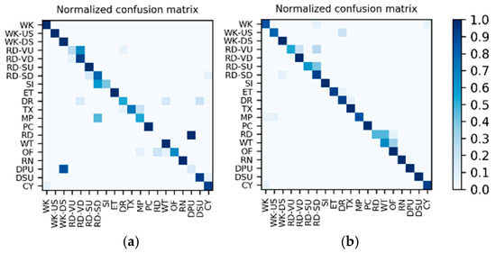 Results on high-frame rate photo stream: The photo streams are classified into the groups defined by in Table 4, so the hybrid data in the Multimodal Dataset were also adjusted according to the group, and the fine-tuned VGG16-LSTM network shown in Figure 7 was established in each of the six groups to complete the training and testing. In addition, similar to the results on motion sensor data, the VGG16-LSTM network and its test results also needed to distinguish 10 splits. In all splits, the lowest and highest accuracy confusion matrices for the VGG16-LSTM network corresponding to each group were as shown in Figure 21. It should be noted that in the groups defined by in Table 4, only and contain multiple activities, so only these two groups needed to train the VGG16-LSTM network. Thus, Figure 21 contains only the confusion matrices corresponding to these two groups. The average accuracy of the 10 splits for each activity in the group is shown in Table 13 and Table 14.
