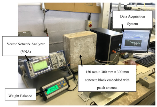 The experimental setup for this investigation is shown in Figure 5. The experimental setup consists of a vector network analyser (VNA), weight balance under the concrete and a data acquisition system designed in LabVIEW program. Reflection signals (S11) were detected from the patch antenna connected to the VNA. All the results were recorded throughout the experiments to quantify the moisture content lost.