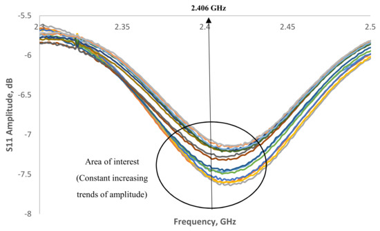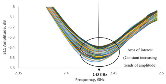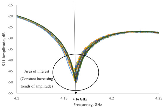 Figure 8 shows the signal spectrum for moisture content in EN 206-1-2013 concrete in a range of 2.35–2.5 GHz reported a small fraction of amplitude increase from −6.5 to −6.39 dB. Figure 9 show the correlation of amplitude with moisture content at R2 = 0.7286. The results show a fair correlation in the region of 2.43 GHz. Further investigation was carried on for the area of interest around 4.16 GHz, which is the second harmonic wave of the designed 2.45 GHz antenna sensor as show in Figure 10. The amplitude increases from −48.3 to −41.5 dB when moisture content decrease. In Figure 11, it is shown the correlation between the amplitude and moisture content. A better linear regression of moisture content relationship with signal amplitude of 4.16 GHz at R2 = 0.9587 can be observed compare to 2.43 GHz. Hence, it is concluded that the designed microstrip patch antenna can accurately monitor the moisture content of the concrete and hence deterioration monitoring of concrete structures.