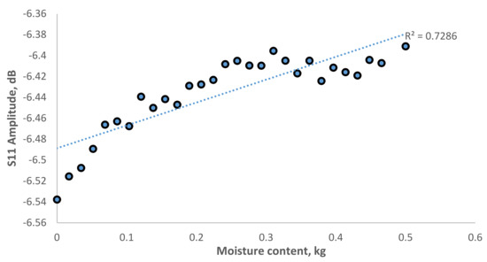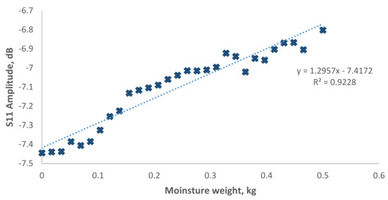 Correlation of S11 amplitude against moisture content in Europe EN 206-1-2013 correlation in 4.16 GHz frequency.