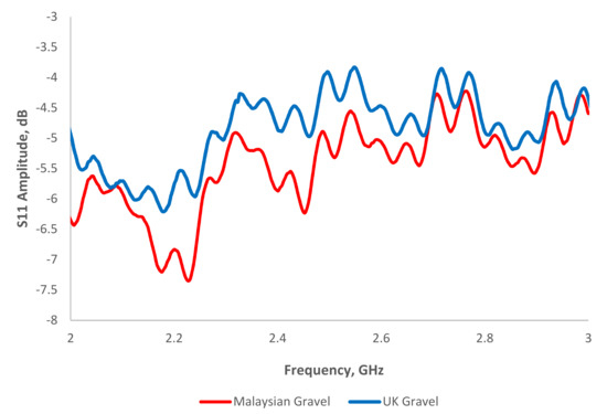 Figure 12 illustrates the signal spectrum of a smart antenna embedded inside two different concrete blocks. Generally, two-signal spectrums show a similar pattern trend but different amplitude values in the range of 2–3 GHz. The difference in the reflected signal variation can be related to the variation in the concrete’s composition. Future work could be interesting to investigate the patch antenna for composition detection for quality issue approach.