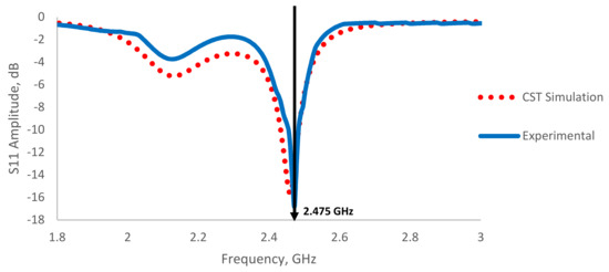 Figure 13 shows the simulated results by using CST studio suit compared to experimental results. It is shown that the signal spectrum is well simulated with 95% of root mean square error. The simulation is well designed for the amplitude peak at 2.45 GHz at −15.6 dB. However, the experimental results show the peak at 2.475 GHz at 16.8 dB, which offset 0.02 GHz from the simulation design. The variation is due to the accuracy of the actual patch antenna dimension and thickness of the materials. Future work is recommended for the high precision machining for production of patch antenna.