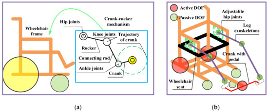 Figure 1 shows the proposed conceptual design of a wheelchair robot with leg-exoskeletons. To address the limitations of wheelchairs that are currently available in the marketplace (i.e., locomotion functions with no assistance for leg exercises), two cycling motion are combined with a wheelchair and a crank-rocker exoskeleton mechanism is then applied to simplify lower limb joint motions. A cycling motion is also incorporated into the design to exercise the leg muscles. Figure 1a, dotted line, shows the user foot trajectory (which is unique to each user) and the related motion pathway; it is safe for persons who lack sufficient strength for manual propulsion. Figure 1b shows the conceptual design in terms of degrees of freedom (DOF). There are three active DOFs: one for leg exoskeleton motion and two for wheelchair motion. There are another nine passive DOFs: six for leg motion assistance (on the exoskeleton) and three for wheelchair motion assistance. For the leg exoskeletons, the DOFs are related to the hip, knee and ankle joints. In addition to the nine passive DOFs, the hip joint connections between the exoskeleton and wheelchair are adjustable per user preference, as shown in the green rectangular area in Figure 1b,. The conceptual design is user-focused such that it addresses user comfort, rehabilitation environment usage, and locomotion and exercise requirements.