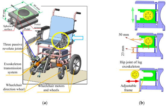 - Huang, G.; Ceccarelli, M.; Zhang, W.M.; Liu, H.X.; Tian, Y.; She, H.T.; Fukuda, T.; Huang, Q. A pedal-actuated wheelchair with a leg exoskeleton. In Proceedings of the 14th IFToMM World Congress, Taipei, Taiwan, 25–30 October 2015; pp. 394–399. [Google Scholar]