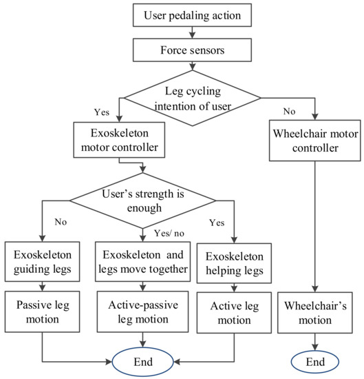 Previous research shows the convenience of combining a wheelchair with leg exercises for locomotion and rehabilitation [19]. Numerous studies have focused on wheelchair-based leg cycling exercises. She et. al. proposed a three-wheel electric cart with a mounted pedal unit to enable leg exercises [20]; the cart used a bilateral master-slave control method under an impedance model to control the cycling motion [21]. While the proposed design is a good solution for users to engage in wheelchair-based leg exercises, there are no force sensors to detect the intended motion of the user (“user motion intention”). Also, motion control requires the user to manually (i.e., use his or her foot) depress the pedal to engage wheelchair movement. This action is generally uncomfortable for the user and is especially unsuitable for persons who require significant mental preparation to engage in simple motions. Furthermore, passive leg motion is difficult to accurately engage under the proposed control method. Other research has focused on Functional Electrical Stimulation (FES) to stimulate specific lower limb muscles for recumbent cycling motion [22,23,24]. Lo et al. proposed an FES-based cycling wheelchair for stroke patients engaged in the recovery stage [25]. Clinical evaluation results showed that the proposed wheelchair was easier to use and more efficient than a manual wheelchair. Tohoku University (Japan) [26] developed Profhand, a commercial cycling wheelchair, which has now been used in numerous studies [27,28,29,30,31]. Hirata et al. [27,28,29] attached a continuously variable transmission (CVT) and servo brake to control movement of the cycling wheelchair. Here, the speed of the cycling motion determines the speed of the wheelchair due to the mechanical connection to the pedal. While this is a viable solution for users with manual strength, it is not suitable for users who lack sufficient strength for manual propulsion due to the absence of motor assistance. A similar design was proposed by Kaisumi et al.; here, a servo motor and brake were added to a cycling wheelchair [30,31]. This modification resulted in better movement across a wide range of slopes.