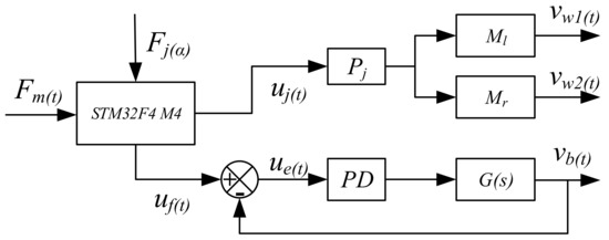 The control design is presented in terms of a user-oriented solution. Figure 4 shows the control design scheme. The control system has two inputs: Fm(t) computed from the force sensors and Fj(α) computed from the joystick signals. The STM32F4M4 is the microprocessor used. The voltage signal, , obtained from the force sensor, is computed as a function of Fm(t); , obtained from the joystick, is computed as a function of Fj(α). The values are used as input data for the control algorithm, as shown in Figure 4. Ml represents the left motor; Mr represents the right motor. Pj is the proportional control from joystick commands to operate the motors Ml and Mr of the wheelchair. G(s) is a model for the operation of the leg-exoskeleton motor. A PD feedback controller controls the velocities of each motor by generating PWM signals. The D control feature is computed from the motor position acquired from an encoder with Kj = 0.2. The control P feature is identified by calibrating with Kp = 6.9. The feedback from the leg-exoskeleton serve-motor, is combined with to give the control signal, ue(t). Gains Kj and Kp along with encoded response dθ(t)/dt generate PWM commands for the motors. The system output is wheelchair motion velocities, νw1(t), νw2(t), and the cycling motion speed, νb (t). Furthermore, the wheelchair velocity can be adjusted per user preference. The PD control is intentionally fairly simple, in order to satisfy market needs (i.e., a ‘value-add’ against competing products) and to ensure user-oriented operation.