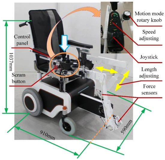 Figure 5 shows another prototype built by the Intelligent Robot Institute (IRI) at the Beijing Institute of Technology (BIT). The prototype dimensions are 910 mm × 590 mm × 1037 mm. While the width is similar to that of a standard wheelchair, the length is longer due to the pedaling system. The turning circle radius is approximately 550 mm, which allows the cycling motion to be engaged in areas exceeding 2 m2. If the space inside the home is insufficient, then the user can exercise outdoors or can pedal with the wheelchair in the stationary position, similar to using a treadmill in a home environment. The operation panel has function buttons for motion modes, speed adjustments and emergency stoppage. The different functions allow the wheelchair motion to be adjusted to the specific physical needs of each user.