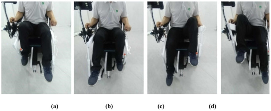The prototype has leg exoskeletons and a pedal system attached to a wheelchair. The leg exoskeleton structure is made from polytef with adjustable links for customization based on user size. The motor was manufactured by the Huisitong Company (Beijing, China). The motor torque of the exoskeleton is 0.27 Nm. To generate the power needed for a normal cycling motion, a planetary reducer is selected with a reduction ratio of 47:1; the motor system output is approximately 13 Nm. The pedal unit is driven by a gear-gear stripe transmission system. The overall weight of the prototype is approximately 25 kg, including the wheelchair structure. The weight of the leg exoskeleton structure is approximately 2 kg.