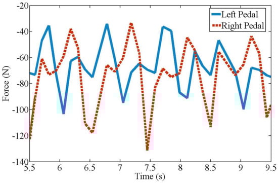 Figure 7 shows the acquired force values, with plot-points indicating a typical cycling motion. In one leg, there are different force values at different pedal positions of the cycling motion [40]. The force values periodically change (approximately every 2 s) throughout the pedaling cycle. The mean force value is approximately 70 N; this value is the leg weight of the user on the pedals. In the experiment, the force values of the left leg ranges from 38 to 95 N and the right leg ranges from 38 to 130 N, which indicates that the right leg of the user is stronger than the left leg. The force values are used as the initial input control signals for Fm(t).