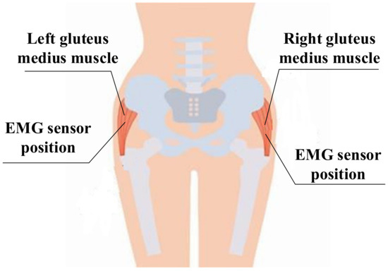EMG sensor positions at left and right gluteus medius muscles locations.