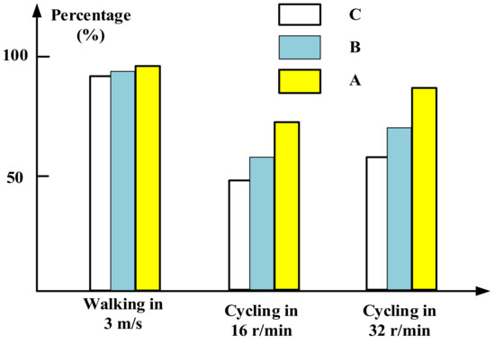 From Figure 9, it can be observed that the gluteus medius muscles are activated both in walking and cycling in different speeds. During the walking, the computed percentages are close to 90%, indicating that the muscles are almost fully activated for all volunteers. During cycling motions, the percentages are measured near to 75% when cycling at 16 r/min, while the percentages are approximately 85% when cycling at 32 r/min. Thus the frequency of muscle activations during walking is higher than during cycling. In addition, percentages from three volunteers when cycling at 16 r/min show that different body sizes present different muscle activations. Volunteers A gets highest percentage indicating that strong persons can get better exercise than thin persons in cycling motion. The other volunteers present similar results and the results from volunteer B are selected as a typical example to analyze the characteristics of the exoskeleton-assisted wheelchair.