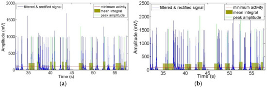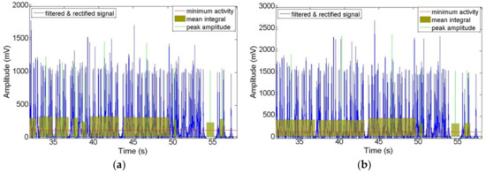 Recorded EMG signals at left and right sides of gluteus medius muscle locations during walking motion: (a) Left side; (b) Right side.
