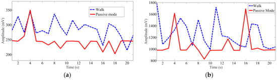 To further clarify the effectiveness of the wheelchair robot exercise, the amplitude characteristics of the EMG signals are analyzed, as shown in Figure 13. A comparison of mean and maximum values for each active event during walking and pedaling in the passive mode (at 16 r/min) shows that the degree of muscle stimulation is equal to or lower than that of the walking process for pedaling with exoskeleton support; in addition, the movements are still less active than that of standard walking. Specifically, the mean values in passive cycling mode at left side are around 240 mV, while the amplitudes are around 300 mV during walking. In addition, the cycling mode shows bigger fluctuation than walking, which indicates gluteus medius muscles can get more activated during cycling. For the maximum values, the variation range of cycling is from about 800 to 1600 mV, while the walking motion is from about 1000 to 1800 mV.