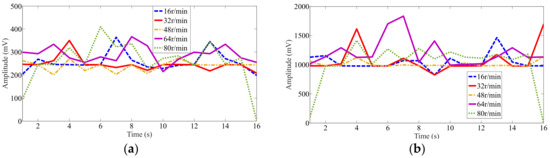 To determine the exercise effectiveness at different cycling speeds, the mean and maximum EMG signal values at the left gluteus medius muscle locations for passive pedaling at different speeds were recorded, as shown in Figure 14. Here, some of the muscle activity mean and maximum values increase as the pedaling speed increases, although the rise is not significant. For the mean value, the maximum amplitude appears at the speed of 80 r/min. At a speed of 48 r/min, the muscles can get the minimum activation. For the mean value, the muscles activations are almost the same at the speeds of 16 r/min and 64 r/min, while the maximum value has a big difference. Consequently, choose the mean or maximum value to evaluate the muscle exercise is important in different cycling motions.