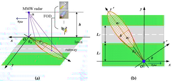 (a) Geometrical model of foreign object debris (FOD) detection; (b) The vertical view of (a).