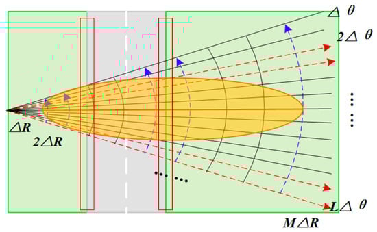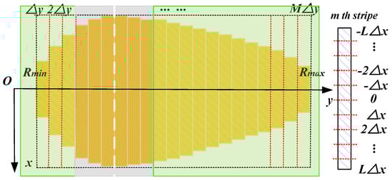 As is shown in Figure 3, we assume the beam exists in the dashed square. We divide the radar coverage into M equal stripes. The width of each stripe is . Each stripe contains 2L grids sized . Thus, every stripe is  in length. We define the grid centers as , where . Notice that the cell area  is independent of  and . These grids are defined as the clutter scattering cells in this paper. We consider that each cell is isotropic where the backscatter coefficient keeps constant.