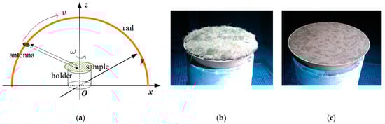 The measuring data have been gathered in our labs. Figure 4a shows the experimental set-up. The typical ground samples (see Figure 4b,c), located on a uniformly rotating holder, are produced into round shapes to minimize the effect of sample configurations. The grazing angle is controlled by an antenna scanning along the arc rail and the azimuth is determined with the holder rotating. Measured RCS data is collected in different azimuth under a certain grazing angle. In addition, sync pulses are employed to synchronize continuous wave transmission and data acquisition.