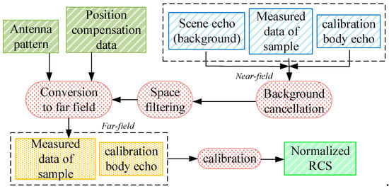 The diagram in Figure 5 explains the measured data processing procedures, mainly involving background cancellation, transformation between near and far-field, as well as calibration. In detail, a standard metal ball with known RCS value has been used as the calibration body in the external calibration experiment at first. Considering the experiment space, the samples are measured at near field. The dotted-line box indicates the echoes received by antenna. Through background cancellation, the echo power is improved by a space filter, and converted to far-field with the support of antenna pattern and position compensation data. The measured sample RCSs are gathered in different azimuth angles and normalized by employing the calibration factor of the standard body. Hence normalized RCSs are obtained by averaging these data in different measuring conditions, which is equal to the backscatter coefficients in numeral.