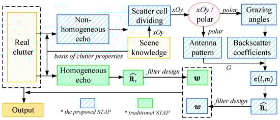 See Figure 6, the clutter properties (homogeneous or not) could be known according to the corresponding range gates. To the homogeneous clutter echo, generated by lawn surface only, we employ traditional STAPs to estimate clutter covariance matrix from real IID samples directly (indicated by the green blocks in the flow diagram). Aided by the scene knowledge and a parameter-modified scattering model, we utilize the clutter-estimation-based STAP for effective suppression to the non-homogeneous clutter at those range gates involving runways and lawns, through scene-knowledge-aided division of scattering cells in xOy coordinates, transformation to polar coordinates (illustrated by pink), back-scattering coefficient acquirement based on the known grazing angles, and clutter echo deduction with the antenna pattern G, and  estimation, as depicted by the blue blocks. Note that the dotted arrow in the figure implies the proposed STAP is real-clutter-decoupling.