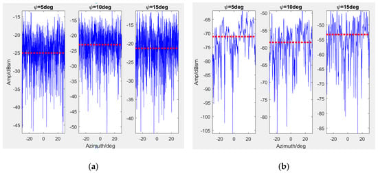 With the side-looking SAR travelling, clutter Doppler is greatly expanded. FOD detection will be challenged because the target is severely fuzzed in the Doppler domain. As the basis of clutter suppression, the MV spectrum is ideal in evaluating the clutter visually and qualitatively. According to Section 3.2, we investigate the MV spectrum of clutter and noise on the space-time plane in Figure 10a–c when the noise power is −60 dBm, −80 dBm and −90 dBm. The ridge-shaped field reflects  only when , known as the main clutter field, indicates where the clutter power mainly focuses. Red lines in Figure 10d–f provide the corresponding clutter suppression when utilizing a LCMV space-time filter.