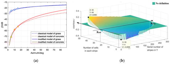 LS fitting results based on Dataset 1 and 2 are given in Figure 8a compared with the Kulemin models. They are considered reliable for the similar trends with the classical models. The coefficients of concrete are at least 36 dB less than those of the grass surface when the grazing angle is very small (≤10 degrees). Note that  also plays as the foundation of ,   and , therefore we calculate  of every cell covered by the SAR in Figure 8b to acquire the corresponding  when . In this case, the grazing angles of cells increase from −0.2006 to 0.2006 and the scattering properties are displayed in Figure 9.