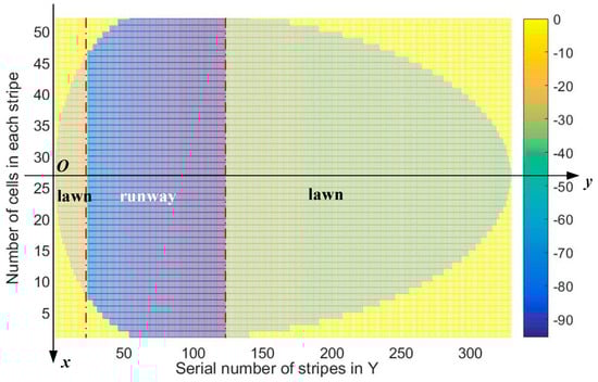 Ground clutter is reflected by the statistical echoes of resolution cells, thus the cell area and backscattering coefficients are both required to calculate the RCS. The common range-azimuth dividing is depicted in Figure 2. The resolutions represented by  and  can be obtained according to the parameters of the transmitting wave. But those cells at the border between different scattering surfaces, such as runways and lawns, are hard to provide exact backscattering coefficients for clutter analysis. Therefore, we consider discussing the xOy system by dividing the radar covering area into several equal grids, which is expected to be more applicable to the straight runways.