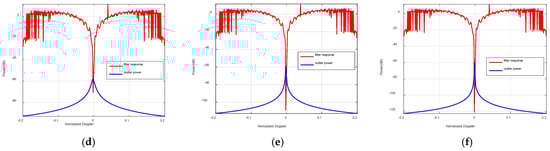 The minimum variance (MV) power spectrum of clutter and noise shows space-time coupling indicated briefly by the ridge-shaped field when the noise power is (a) −60 dBm; (b) −80 dBm; (c) −90 dBm; the optimal response obeying linearly constrained minimum variance (LCMV) when the noise power is (d) −60 dBm; (e) −80 dBm; and (f) −90 dBm.