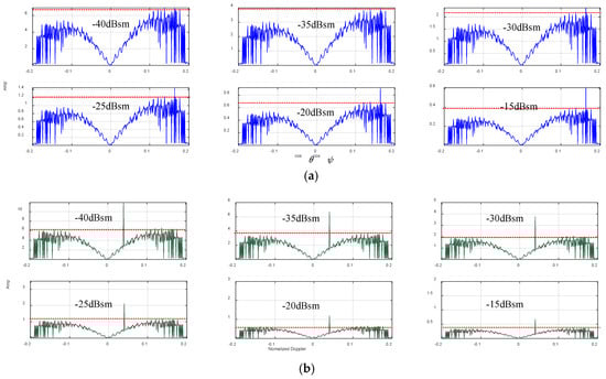 Disturbed by −60 dBm noise, the simulations in Figure 11a demonstrate that false alarms are produced and the interference effective azimuth indication occurs when a target RCS is smaller than −30 dBsm. Meanwhile, we have also noticed that false alarms, generated by non-homogeneous scattering within radar coverage, exist all over the space-time plane especially in the azimuth domain. But the space-time filtering works well to all six targets in Doppler very clearly. Theoretically, motive objects are distinguished from the scattering cells in Doppler, which benefit the SAR system. In practical operation, a lower false alarm rate could be obtained by setting a threshold decision coefficient according to the characteristics and the distribution of clutter, which will be validated in future work.