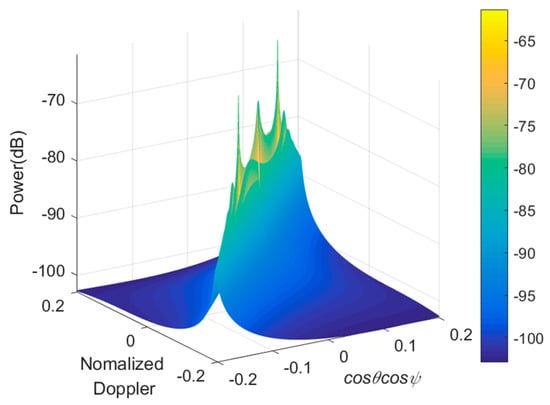 In order to illustrate that the proposed method performs better than state-of-the-arts, samples from different range gates are utilized for filtering in the space-time domain. The number of range gates are expressed as  where  denotes rounding-up. Thus, there are 439 range gates covered by the SAR according to the parameter setting in Table 3. Figure 12 illustrated the MV spectrum brought by the error of clutter covariance matrix estimation, employing insufficient IID echo from some range gates. As a result, traditional estimation in Figure 13 cannot provide satisfactory clutter suppression when compared with the presented STAP. Obviously, estimation errors directly lead to unnecessary suppression on the space-time plane rather than the main clutter field, which always manifests as decreased SCNR of the filter output.