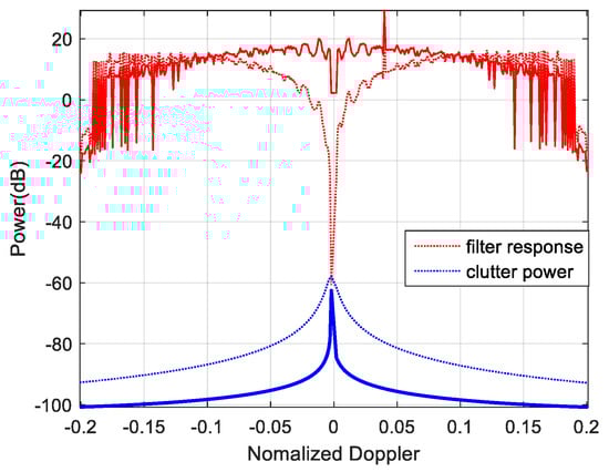 Obviously, the space-time coupled clutter is significantly suppressed to nearly −70 dB, −110 dB, and −120 dB, which is ideal referring to the corresponding red lines, which illustrate the power at clutter ridges achieving about 40 dB, 60 dB, and 70 dB higher than that on the other field of space-time plane. Taking a LCMV filter as the example, it works well for the following reasons: the power of the desired signal can be kept and the variance of the filter output is minimized as well. In fact, some filters obeying the other criteria (e.g., MSNR, MMSE) could also reach similar performances.