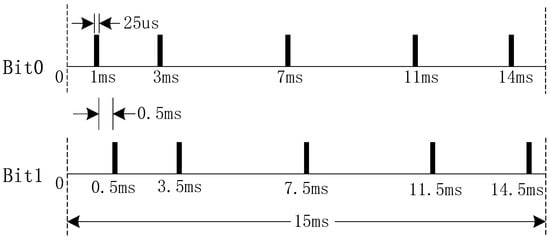 In PPM, data is modulated and transmitted with short pulses all of which have the same width and amplitude. The difference among the pulses is the delay between each pulse. A short duration represents digital 0, and a large duration represents digital 1. In this paper, we applied the following coding format, as shown in Figure 1. The bit ‘0’ is represented by 5 pulses that are set at 1 ms, 3 ms, 7 ms, 11 ms and 14 ms with the frame period of 15 ms and the pulse width of 25 . Correspondingly, the pulses standing for bit ‘1’ are set at 1.5 ms, 3.5 ms, 7.5 ms, 11.5 ms, and 14.5ms. After the MCU (microcontroller unit) receives the data from the PC, it will send the data in the format of “55DataAA” to meet the synchronization requirements in demodulation.