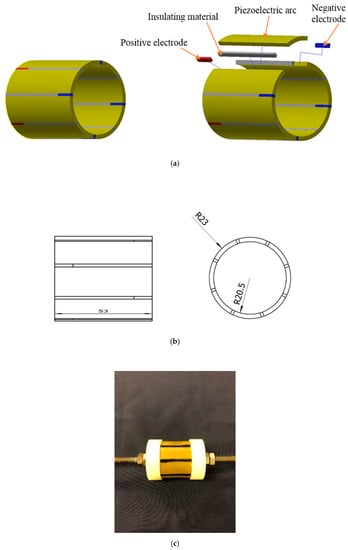 The new transducer was designed to generate high-amplitude stress waves upon touching. The motivation for developing such a piezoceramic transducer is for future robotics applications and the actuator design can be incorporated on the hand of a robot to enable stress wave communication upon “touch.” The developed tranducer consists of eight piezoceramic arc segments assembled in parallel to increase vibration amplitude. PZT (lead zirconate titanate), a type of piezoceramic material with strong piezoelectric effect, is used in this research. When excited by an alternating voltage, the eight piezoelectric segments will experience radial deformation. This design of the PZT transducer enables the transmission of the stress wave from the transducer to a pipeline through contact or upon touching. There is no requirement to permanently install the PZT transducer. Table 2 lists the key parameters of the transducer. Figure 3 shows the detailed design of the transducer, which includes the components, dimensions, and a photo. In Figure 3, the red segments represent positive electrodes, and the blue segments represent negative electrodes.