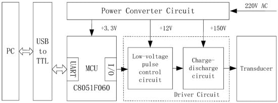 As shown in Figure 4, the PPM signal generator is composed of a MCU, a driver circuit, and a power converter circuit. The MCU receives data from the PC, encodes data, and then sends out the encoded data to the driver circuit. The driver circuit combines a low-voltage pulse control circuit with a high-voltage charge-discharge circuit to generate high-voltage pulse signals. The low-voltage circuit controls the high-voltage circuit via an isolation transformer, thereby improving the driving capacity of the metal-oxide-semiconductor field-effect transistor (MOSFET). The high-voltage capacitor and transducer are instantaneously turned on to form up a discharging loop when the MOSFET is turned on, thus actuating the transducer. The power converter circuit converts an input AC voltage into a DC voltage to serve as a low-voltage DC power supply for the MCU control circuit and a high-voltage DC power supply for the driver circuit as well.