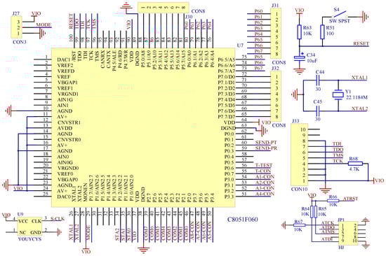 The 16-bit single-chip microcomputer C8051F060 is selected for the microcontroller unit, since it features a high-speed CIP-51 core that is compatible with the 8051 microcontroller, an enhanced universal asynchronous receiver-transmitter (UART) serial interface with hardware address recognition for asynchronous serial communication, a general-purpose timer, and a 16-bit analog to digital converter (ADC). As shown in Figure 5, the unit consists of one C8051F060 microcontroller, one clock circuit, one reset circuit and one debug interface. The clock circuit includes C44, C45 and Y1, which uses a 22.1184 MHz crystal oscillator to clock the microcontroller and peripherals. The reset circuit uses a 10 µF capacitor C34 to achieve power-on reset. The port connecting to UART receives data from the PC, the I/O port P0.7 is working as the signal transmission pin to output the encoded data, and the timer T1 is applied while encoding data based on the data transmission protocol.