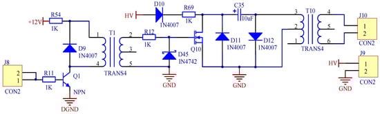 As shown in Figure 6, the driver circuit consists of a low-voltage pulse control circuit and a charge-discharge circuit. The low-voltage pulse control circuit is composed of an NPN transistor Q2, a transformer T2, and a Zener diode D46. As presented in the left part of Figure 6, if the input pulse voltage at J11 is high, then the transistor Q2 will be turned on, and the current will pass through R55. The current will be generated at the output of T2 due to induction, and then passes through the resistor R13 to drive the MOSFET. The diode D46 acts as a regulator to limit the voltage across R13. On the contrary, if the input pulse voltage at J11 is low, the transistor Q2 is turned off and thereby the driving circuit will not drive the MOSFET.