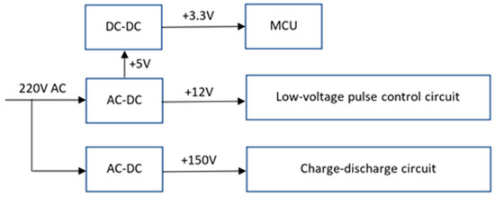 As shown in Figure 7 and Figure 8, the input AC voltage (220 V) is reduced to ±5 V DC or ±12 V DC by the AC/DC switching power supply module. The +5 V DC is stepped down to +3.3 V via DC-DC to work as the power supply for MCU, and the +12 V DC is used as the power supply for the low-voltage pulse control circuit. On the other hand, another 150 V DC from the AC/DC module serves as the power supply for the charge–discharge circuit.