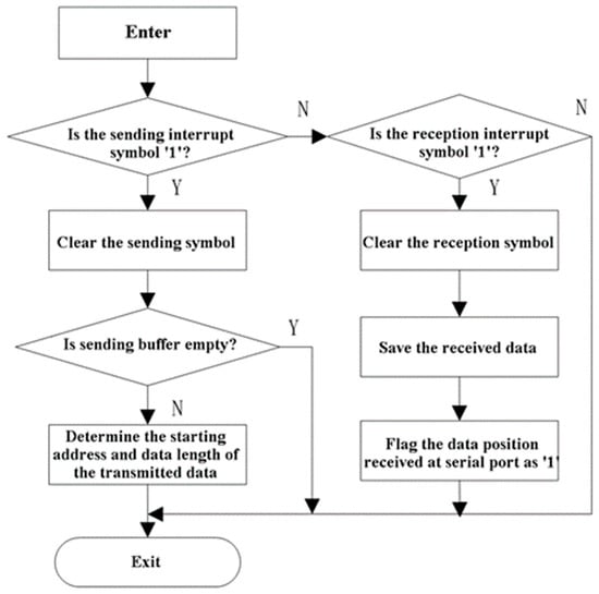 The serial interrupt program handles the data reception and emission. Port 1 is used to complete the communication between the MCU and the PC. Timer 2 works as the baud rate generator of port 1 with the baud rate of 115200 bps. As shown in Figure 10, after entering the serial interrupt program, the first step is to determine the interruption type. If the reception caused the interruption, the program will save the data in a reception buffer and flag the data position received at the serial port as 1. Otherwise, if sending caused the interruption, the program will determine the starting address and byte length of the data, and transmit the data in sequence.