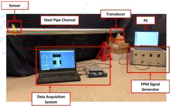 As shown in Figure 12, the stress wave communication system consists of a cylindrical piezoceramic transducer, a piezoceramic probe as a sensor, a data-acquisition system, a PC with the communication software, and the PPM signal generator. In the experiment shown in Figure 13, a galvanized steel pipe with an outer diameter of 54 mm and length of 3 m served as the transmission medium. In the setup, the PC controls the transmission of the binary sequence via the USB port, and the generator produces the modulated electrical signals based on the coding format described in Section 4.2. The transducer converts the electrical signals to stress waves that propagate along the pipe, and the piezoelectric probe captures the stress waves. Data from the probe was sampled at 400 kHz. Please note that in the experiment, the developed PZT transducer transmitted the stress wave upon touch since the design of the PZT transducer enables the transmission of the stress wave from the transducer to a pipeline through contact. There is no requirement to permanently install the PZT transducer.